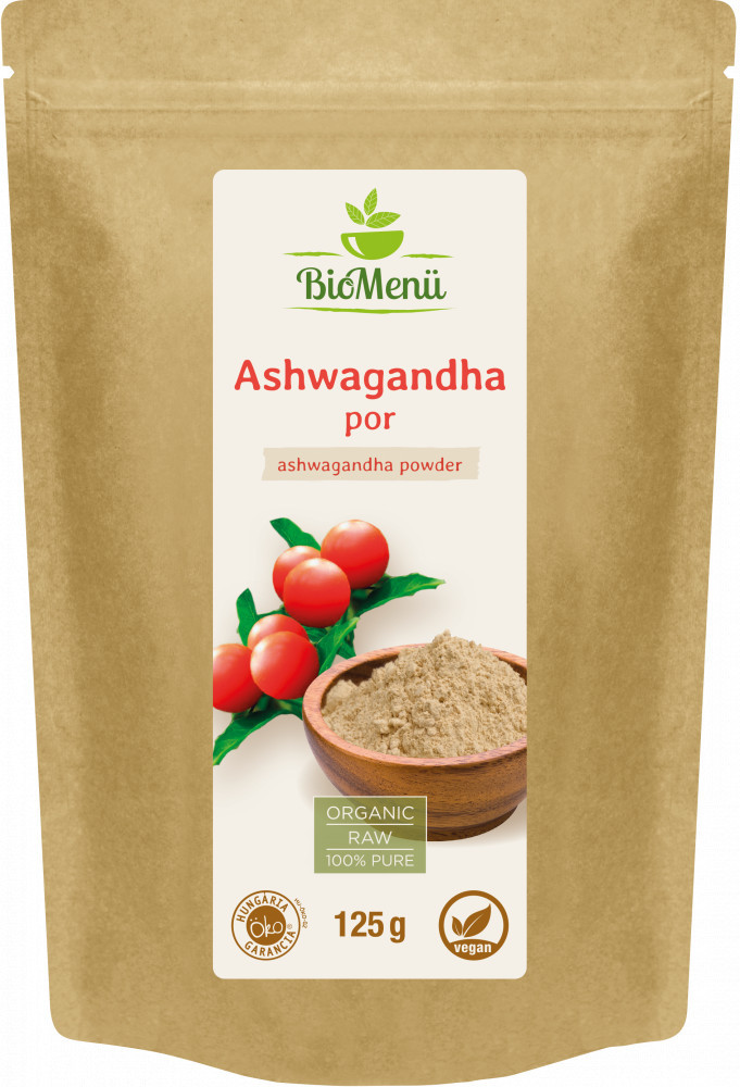 Az ajurvédikus gyógynövények közül egyre szélesebb körben válik ismertté az India szárazabb régióiban honos Ashwagandha, más néven indiai ginzeng. A BioMenü BIO Ashwagandha por a fa gyökerének őrleménye, 100%-ban természetes, GMO mentes, nem tartalmaz adalékanyagokat, vegyszert és szennyeződéseket sem. Biológiailag aktív összetevői az alkaloidok, a szteroid laktonok, a szaponinok, a vas és a kolin, illetve 18 különböző zsírsavat, számos polifenolt és fitoszterolt is tartalmaz. Kúraszerű szedése serkentheti a növekedési hormont, a pajzsmirigyműködést és a libidót, hatékonyan enyhítheti a stressz és a depresszió tüneteit, javíthatja az agyműködést, a szellemi teljesítményt és ellenállóbbá teheti a szervezetet, külsőleg alkalmazva enyhítheti a köszvénybetegség tüneteit.