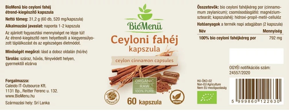 Összetevők: 100% bio fahéj (cinnamomum zeylanicum / verum); hidroxipropil-metilcellulóz alapú 00-ás méretű kapszula, 100% hipromellóz.