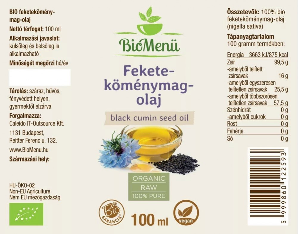 100%-ban természetes fekete köménymag-olajból álló termék. A GMO-mentes feketeköménymagok hideg sajtolásával állítják elő. Tartósítószer, ízesítők és színezékek nélkül.