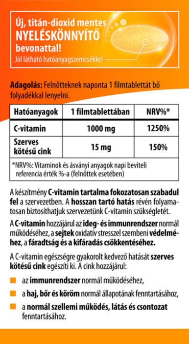 A készítmény C-vitamin tartalma fokozatosan szabadul fel a szervezetben. A hosszan tartó hatás révén folyamatosan biztosíthatjuk szervezetünk C-vitamin szükségletét.