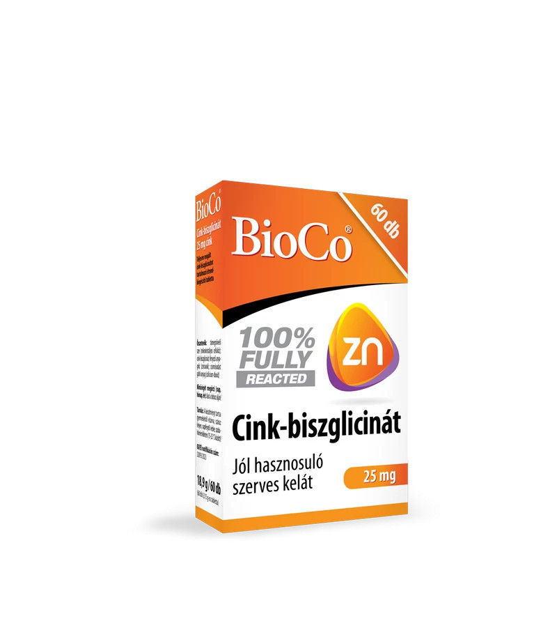 A BioCo® Cink-biszglicinát készítmény magas dózisban, 25 mg mennyiségben biztosít cink pótlást, mindössze napi 1 tabletta fogyasztásával. A készítményben új típusú, magas tisztaságú, 100%-ban teljesen reagált (fully reacted) cink-biszglicinát biztosítja a szerves vegyületformájú cink pótlását.