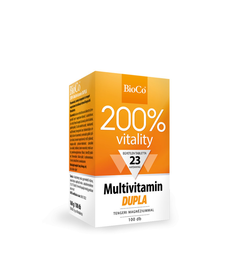 A BioCo® 200% Multivitamin DUPLA minden vitaminból 200%-ot tartalmaz, amely a felnőttek számára javasolt napi referenciaérték duplája. A 13 féle vitamint további 10 féle ásványi anyag egészíti ki, többségük szerves, a szervezet számára jól hasznosuló formában került a készítménybe.