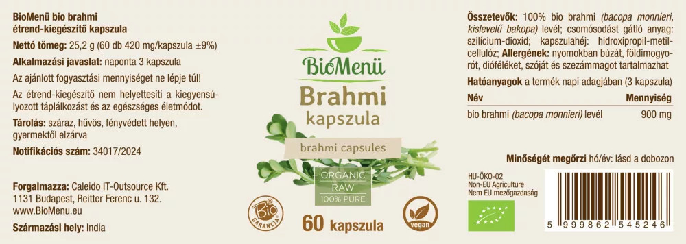 100% bio brahmi (bacopa monnieri, kislevelű bakopa) levél; csomósodást gátló anyag: szilícium-dioxid; kapszulahéj: hidroxipropil-metil-cellulóz; Allergének: nyomokban búzát, földimogyorót, dióféléket, szóját és szezámmagot tartalmazhat