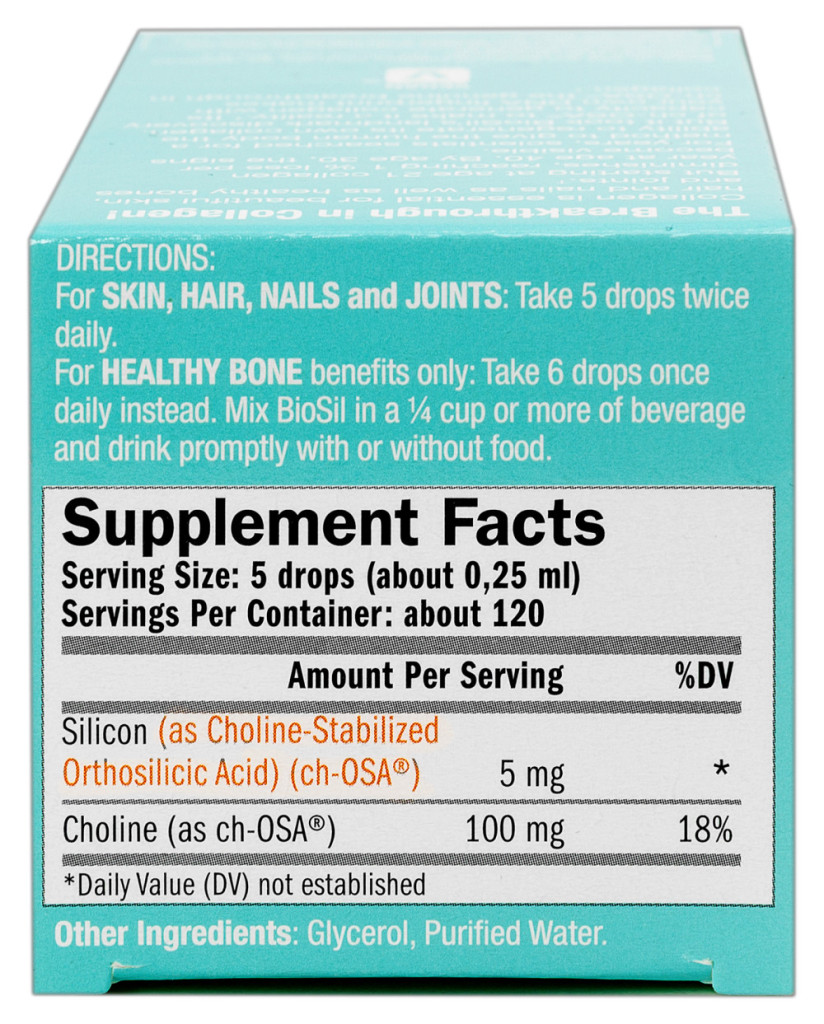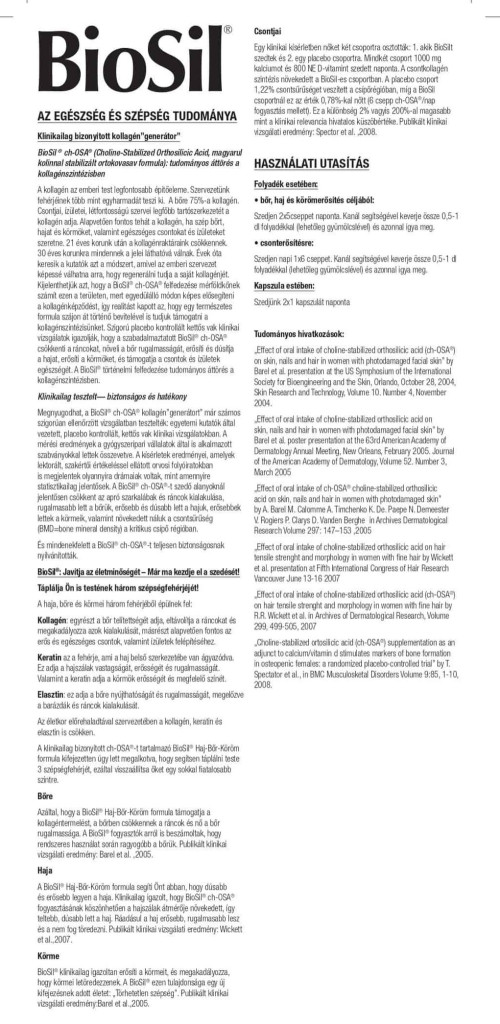 Csontok: Egy klinikai kísérletben nőket két csoportra osztották: 1. akik BioSilt szedtek és 2. egy placebo csoportra. Mindkét csoport 1000 mg kalciumot és 800 NE D-vitamint szedett naponta. A csontkollagén szintézis növekedett a BioSil-es csoportban. A placebo csoport 1,22% csontsűrűséget veszített a csípőrégióban, míg a BioSil csoportnál ez az érték 0,78%-kal nőtt (6 csepp ch-OSA®/nap fogyasztás mellett). Ez a különbség 2% vagyis 200%-al magasabb, mint a klinikai relevancia hivatalos küszöbértéke.Publikált klinikai vizsgálati eredmény: Spector et al. ,2008.
