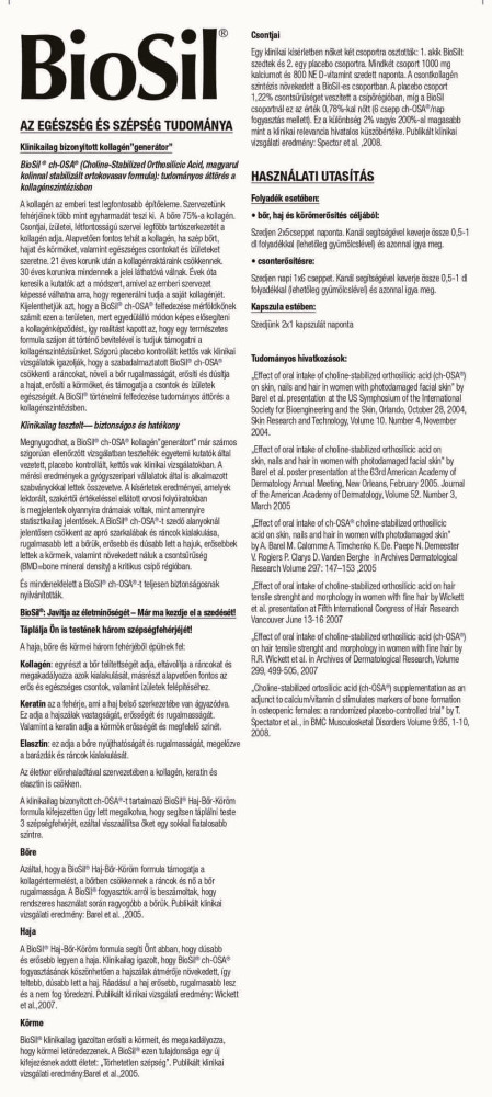 Haj: A BioSil® Haj-Bőr-Köröm formula segíti Önt abban, hogy dúsabb és erősebb legyen a haja. Klinikailag igazolt, hogy BioSil® ch-OSA® fogyasztásának köszönhetően a hajszálak átmérője növekedett, így teltebb, dúsabb lett a haj. Ráadásul a haj erősebb, rugalmasabb lesz és a nem fog töredezni.Publikált klinikai vizsgálati eredmény: Wickett et al.,2007.