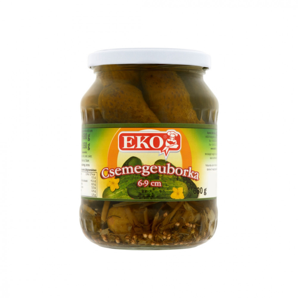 Friss, egészséges uborka üvegben sós-ecetes-cukros felöntőlében, kaporral, sárga mustármaggal és természetes csemegeuborka ízesítő aromával ízesítve, hőkezeléssel tartósítva