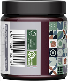 Összetevők: szőlőmust sűrítmény, meggy (40%), málna (10%), ivóvíz, zselésítő anyag: pektin, citromlé sűrítmény, szárított levendulavirág.