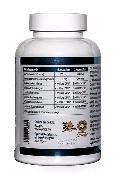 Összetevők: Brahmi (Bacopa monnieri), Ashwagandha (Withania somnifera), Élőflóra keverék (B. infantis, B. longum, L. brevis, L. helveticus, B. breve, L. plantarum.), gyomorsaválló HPMC cellulóz kapszulahéj.