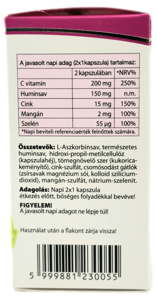 C-Vitamin, Huminsav, Cink, Mangán és Szelén tartalmú étrend-kiegészítő kapszula. Segíti az ásványi anyagok, vitaminok sejtszintű beépülését és elraktározását a szervezetben. A sejtjeinket hozzuk olyan állapotba, hogy a vírusok ellen védekezni tudjanak – immunrendszer rásegítés egy természetes anyaggal.