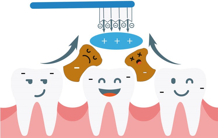 Működési elve: fogmosás közben erős negatív töltésű ionokat bocsájt ki a fogkefe, melynek hatására megszakad a plakkok és a fog közötti kötődés. Ezt követően a sörték könnyedén eltávolítják a fog felszínéről a lepedéket, szennyeződéseket, így frissíti ínyünket és akadályozza meg a fogszuvasodást, ínygyulladást.