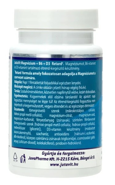 A retard JutaVit Magnézium + B6 + D3 fokozatosan adagolja szervezetünk számára a magnéziumot. A magnézium és a B6 vitamin hozzájárul az idegrendszer megfelelő működéséhez, a normál pszichológiai funkciók fenntartásához, a fáradtság és a kifáradás csökkentéséhez.