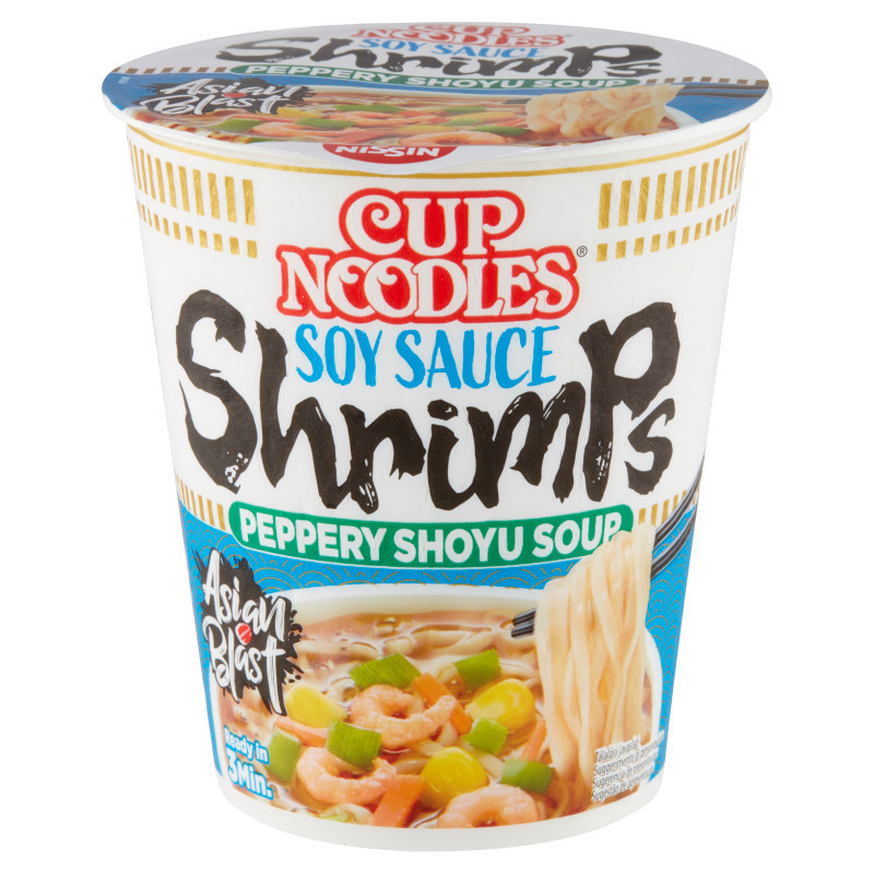 tészta 85,9% [búzaliszt, pálmaolaj, étkezési só, ízfokozó (E621), lisztkezelő szerek (E500, E451), antioxidáns (E306), savanyúságot szabályozó anyag (citromsav)], cukor, garnélarák készítmény [garnélarák 1,4% (a száraz végtermékben), cukor, étkezési só, szezámolaj], étkezési só, sárgarépa, szójaszósz por 1,1% (szójabab, búza, étkezési só, maltodextrin), kukorica, zöldhagyma, maltodextrin, glükózszirup, aromák (tartalmaz búzát, szóját, halat), bors 0,5%, fűszerek, ízfokozók (E621, E627, E631), savanyúságot szabályozó anyag (citromsav), színezék (E150c), csomósodást gátló anyag (E551).