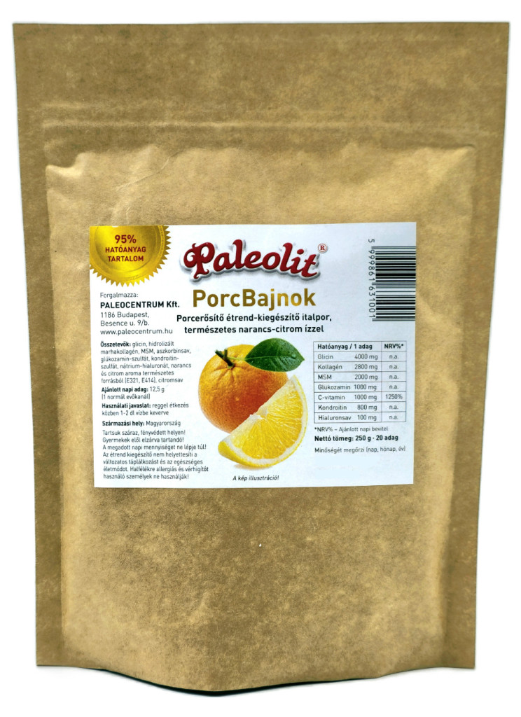 Narancsos-Citrom ízű porcerősítő italpor, természetes összetevőkből. A PorcBajnok egészségtudatos embereknek készült, azzal a céllal, hogy támogassa a kialakult vagy kialakulóban lévő porckopásokat, ízületi bántalmakat- és sérülések megelőzését és megoldását. Olyan elismert porcerősítő összetevőket választottunk, mint a kollagén, a glükozamin és az MSM.