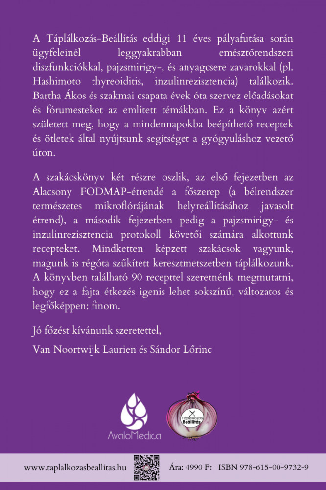 Ez a könyv azért született meg, hogy a mindennapokba beépíthető receptek és ötletek által nyújtsunk segítséget a gyógyuláshoz vezető úton. A szakácskönyv két részre oszlik, az első fejezetben az Alacsony FODMAP-étrendé a főszerep (a bélrendszer természetes mikroflórájának helyreállításához javasolt étrend), a második fejezetben pedig a pajzsmirigy- és inzulinrezisztencia protokoll követői számára alkottunk recepteket. A könyvben található 90 recepttel szeretnénk