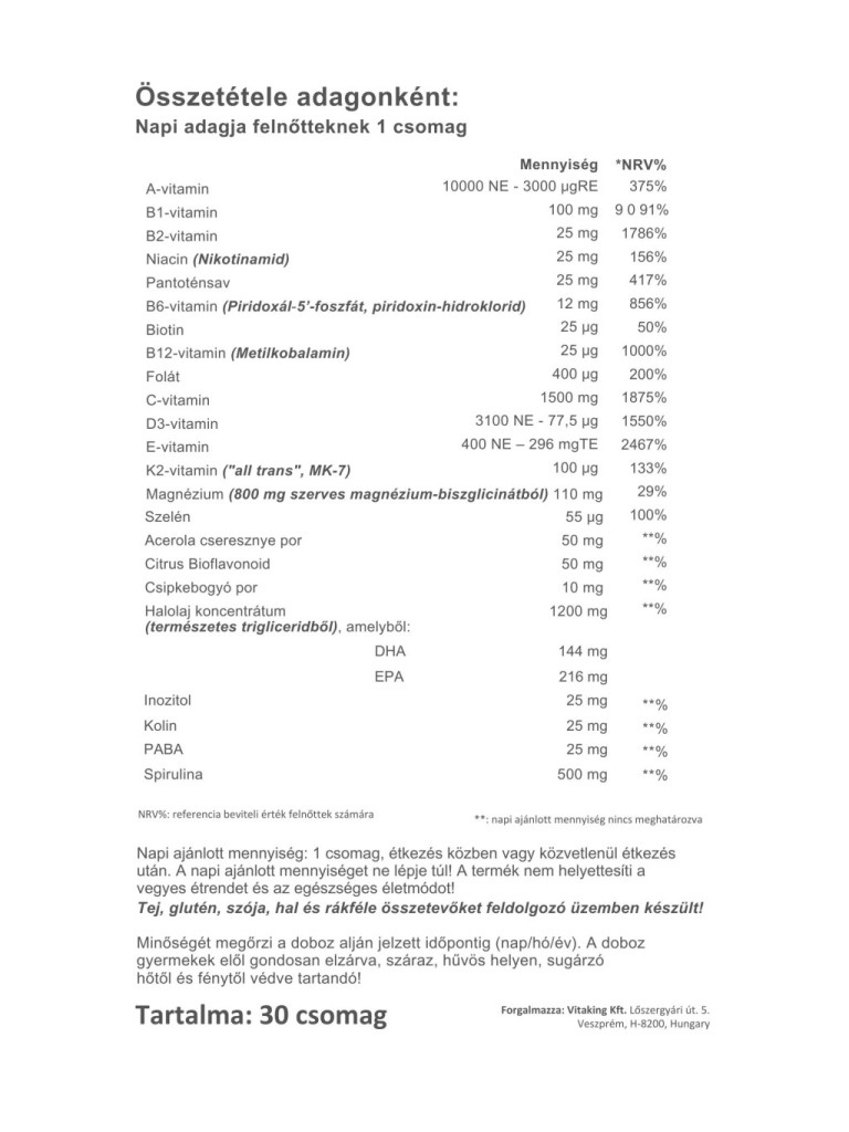 Minden doboz tartalmaz 30 kényelmesen hordozható zacskót, ami minden létfontosságú vitamint és ásványi anyagot és egyéb tápanyagokat tartalmaz optimális formában. Minden napi multivitamin csomag tartalmazza az alábbi 8 készítményt: