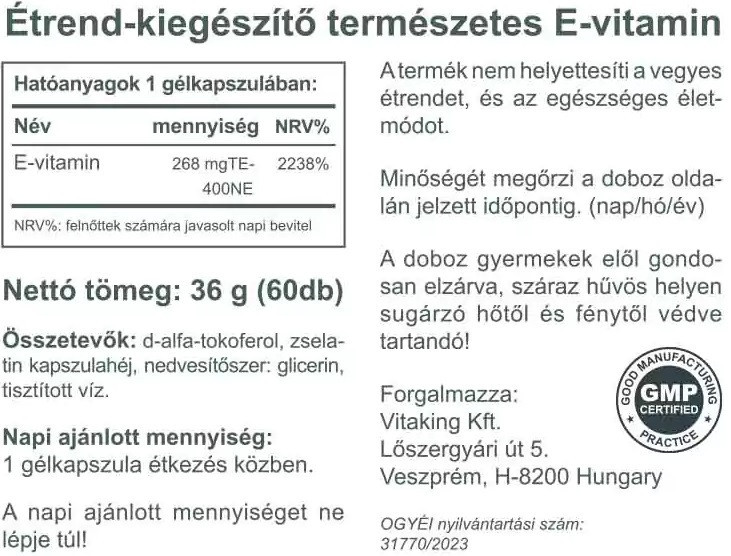 A Vitaking E-vitamin 400NE E vitamint tartalmaz. Számos kutató szerint a természetes változata (d-alpha) hatékonyabb és jobban felszívódik, mint a szintetikus (dl-alpha) változat.