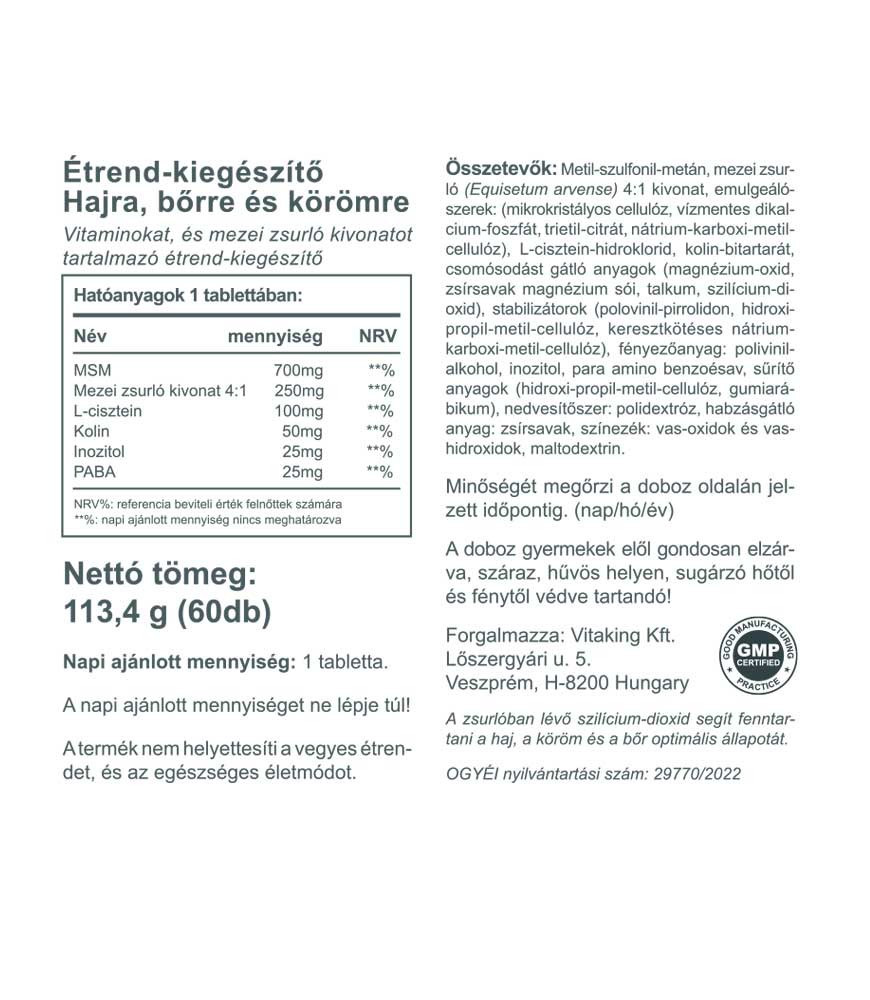 A szépség belül kezdődik az önbizalmadnál és a szervezeted számára nélkülözhetetlen tápanyagoknál. Fedezd fel a természetes szépségápolás erejét a Haj, bőr, köröm komplexben! A Vitaking Haj, bőr, köröm komplex készítmény speciálisan a szép és egészséges haj, bőr, köröm támogatására szolgáló készítmény. Tartalmaz többek között kolint, inozitolt, l-cysteint, mezei zsurlót és MSM-et is.