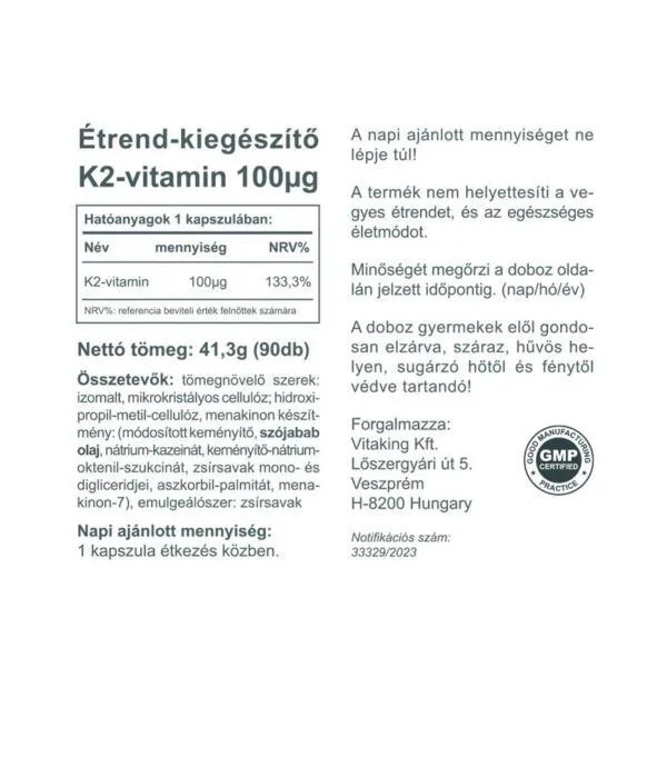 A Vitaking K2 vitamin 100µg MK7 vitamint tartalmaz.