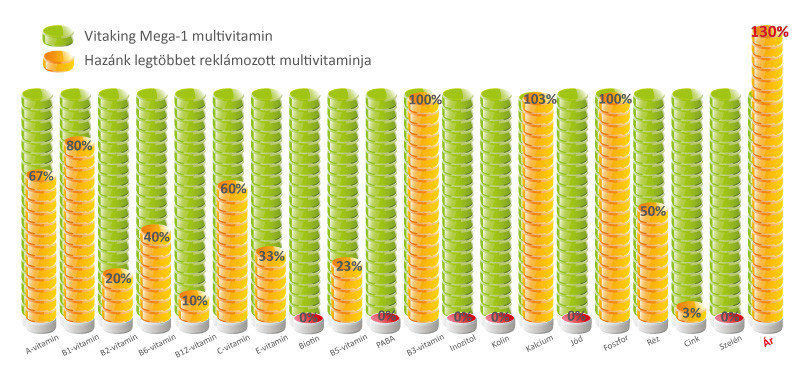 A legtöbbet reklámozott multivitamin készítmények csak az árukban többek, mint a Vitaking Mega1 multivitamin. Nézd meg képgalériában található összehasonlítást és vedd fontolóra milyen multivitamint választasz!