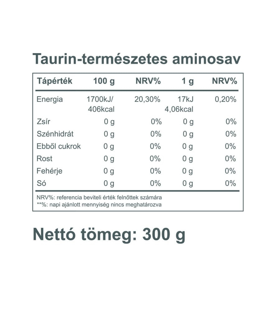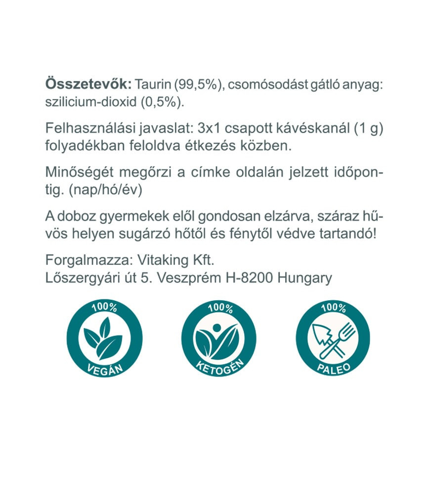 Összetevők: Taurin (99,5%), csomósodást gátló anyag: szilicium-dioxid (0,5%).