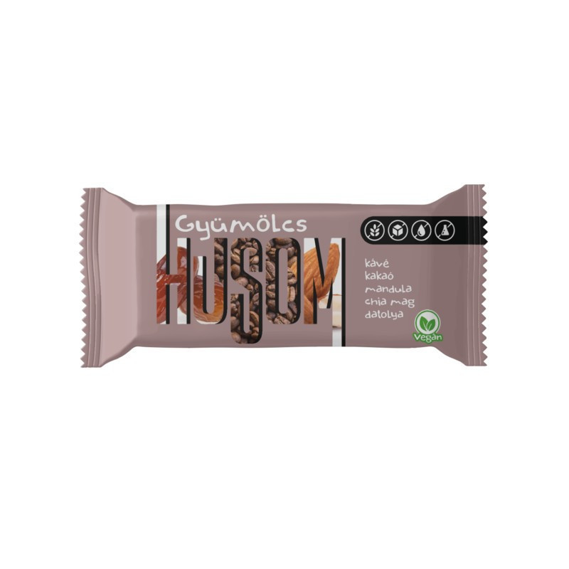 Gyümölcs Husom natúr gyümölcsszelet kávéval, kakaóval, mandulával, chia maggal és datolyával.