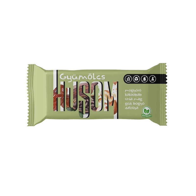 Természetes, finom és könnyű: a mogyorós Gyümölcs Husom igazi ínyenc falat. Bátran válaszd, ha elmerülnél a mentes, vegán kényeztetés mámorában.