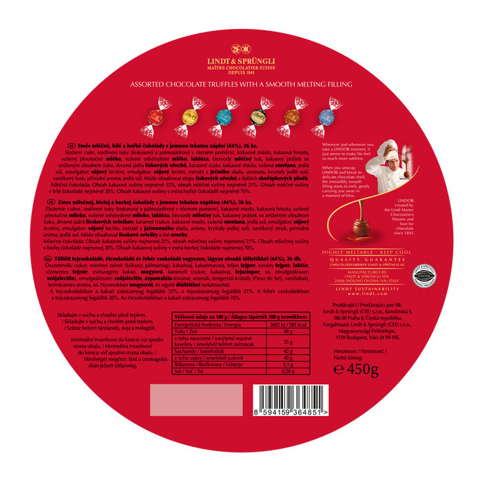 Töltött tejcsokoládé, étcsokoládé és fehér csokoládé vegyesen, lágyan olvadó töltelékkel (44%), 36 db