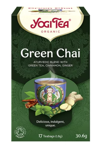 Tea azok számára, akik egy teljesen új módon szeretnék megtapasztalni a zöld teát. Amikor olyan népszerű italok, mint a zöld tea és chai egyesülnek egy YOGI TEA®-ban, akkor az eredmény igazán különleges lesz. A zöld tea élénkíti a testet, a chai fűszerek megnyugtatják a lelket és egy új élménnyel lesz gazdagabb az elménk. Érezni fogja, amikor időt szán arra, hogy élvezze ezt az egyedülálló ízkombinációt. Lenyűgöző teaélmény, amelyet még élvezetesebbé tehetünk, ha édesítjük és egy kevés tejet vagy más vegán tejhelyettesítőt adunk hozzá.