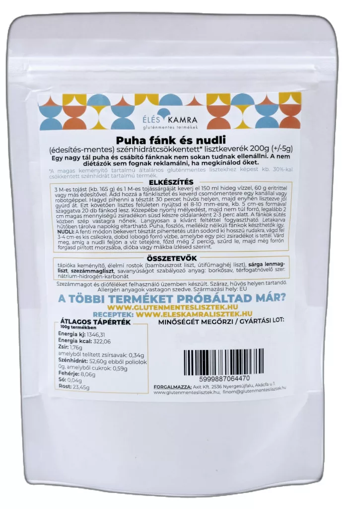 • 1 csomag Éléskamra Puha fánk és nudli szénhidrát csökkentett* lisztkeverék