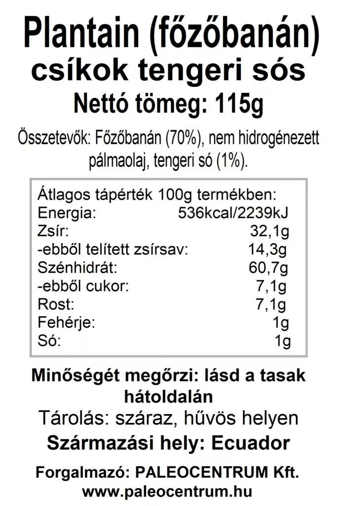 Összetevők: Főzőbanán (70%), nem hidrogénezett pálmaolaj, tengeri só (1%).