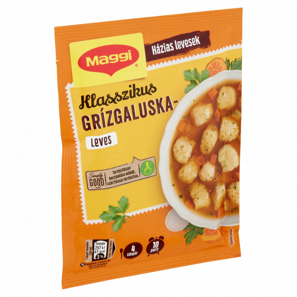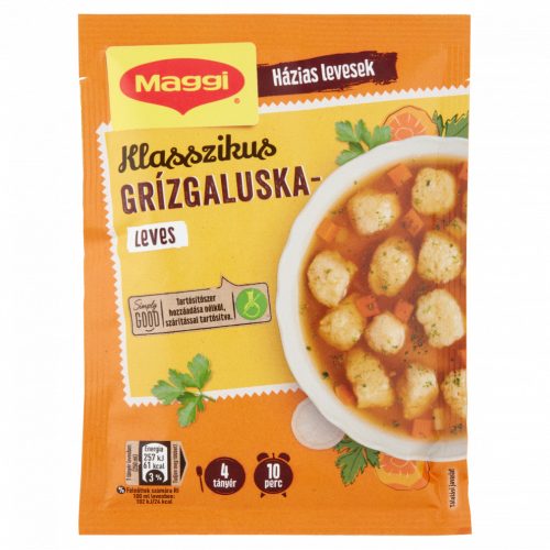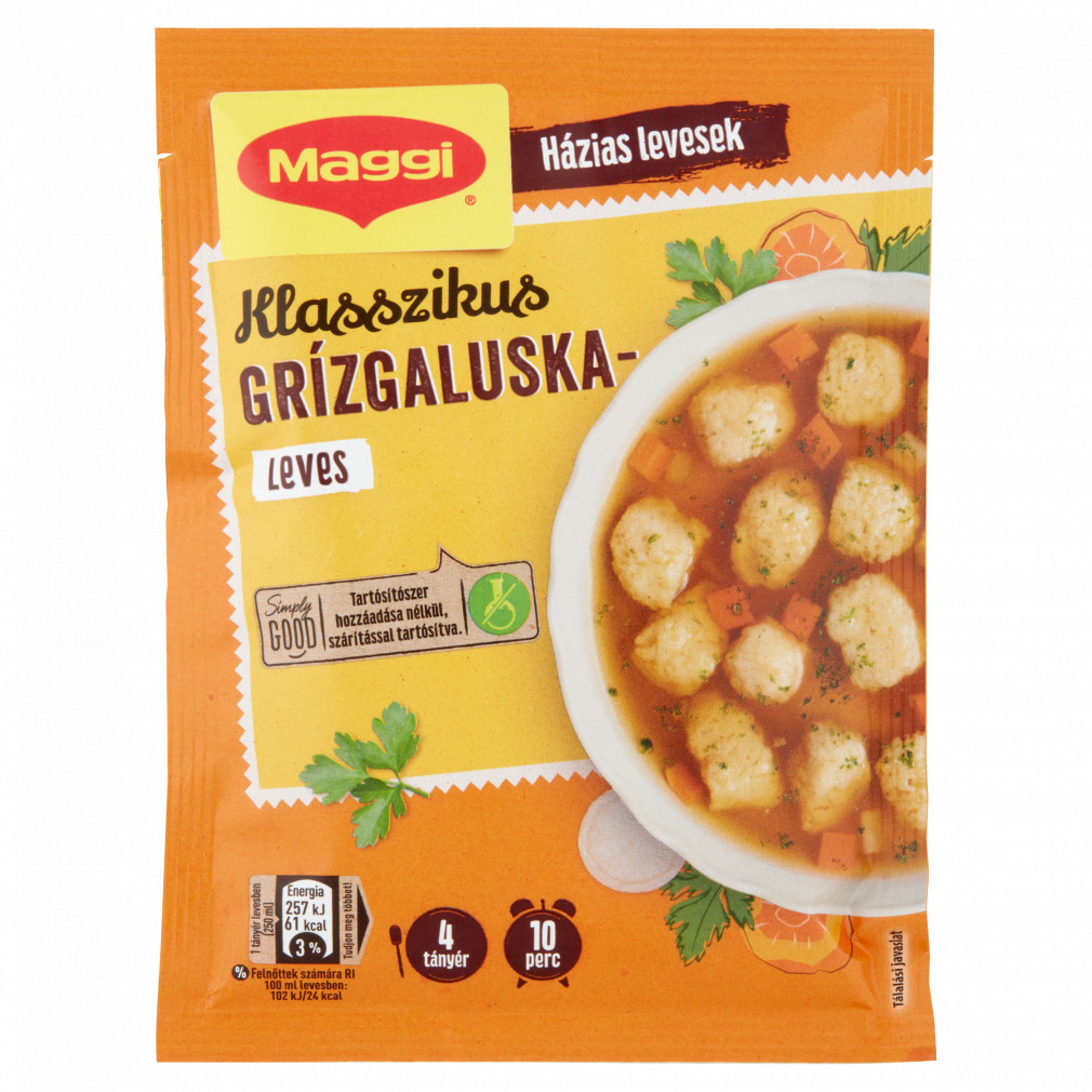 Grízgaluska 61% (búzadara 38,1%, marhazsír (marhazsír, antioxidáns: rozmaringkivonatok), tojásfehérje és -sárgájapor, búzaglutén, jódozott só, cukor, őrölt szerecsendió), Jódozott só, Szárított élesztőkivonat (élesztőkivonat, étkezési só), Szárított zöldségek 5,4% (sárgarépa, paszternák, petrezselyemlevél), Ízfokozók: nátrium-glutamát, dinátrium-inozinát, Maltodextrin, Aromák, Csirkezsír (csirkezsír, antioxidáns: rozmaringkivonatok), Cukor, Pálmaolaj, Burgonyakeményítő, Őrölt fűszerek (feketebors, szerecsendió), Árpamaláta-kivonat, A %-os értékek az összetevők termékben jelen lévő mennyiségét jelentik