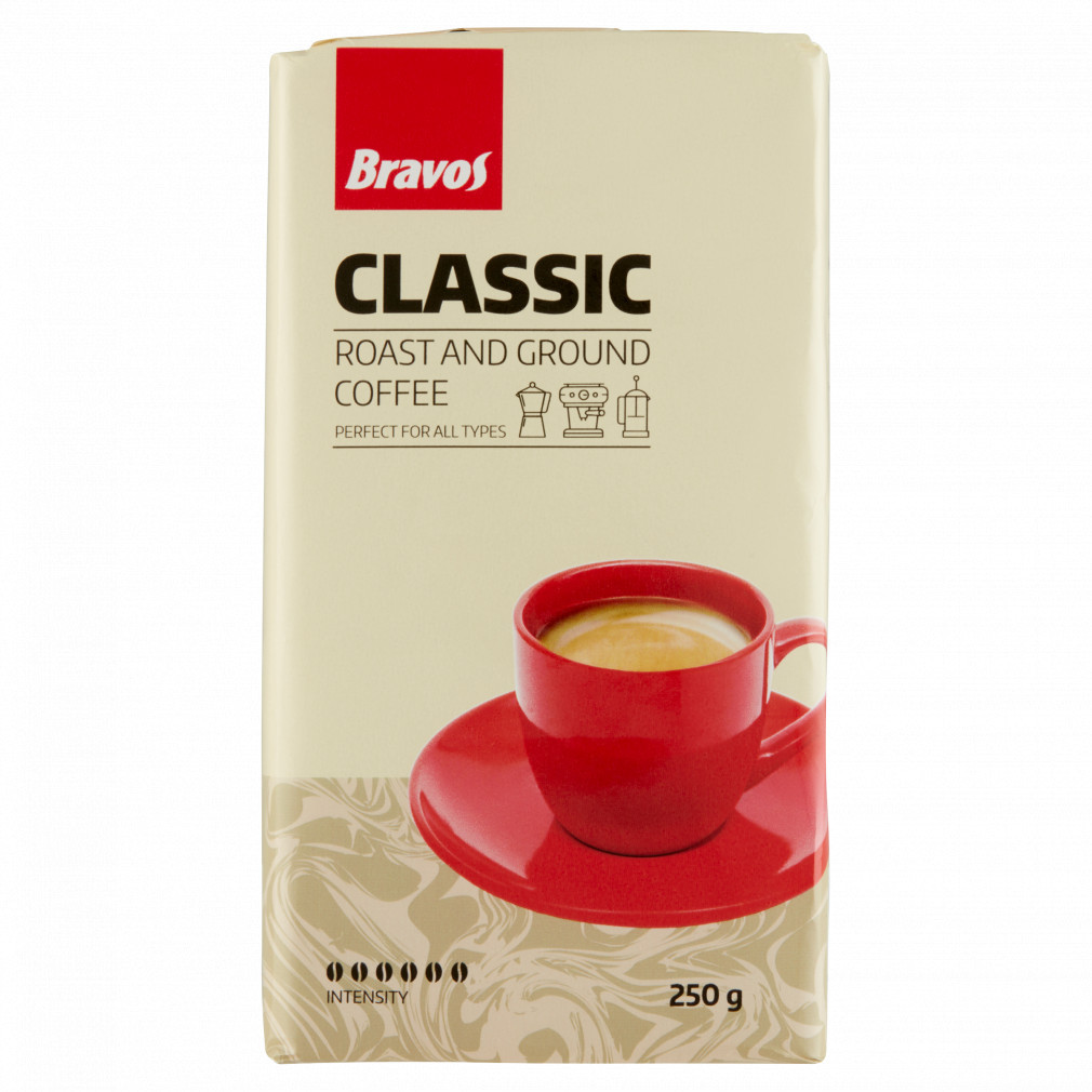 Ki kell emelnünk a hazai háztartásokban megbízható minősége és versenyképes ára folytán méltán népszerű Bravos Classic családot. Intenzitása: 6-os. Erős, magas koffeintartalmú kávé. Megtalálhatók 250gr, 1000gr vákuumcsomagolású őrölt termékek, illetve 1000gr szemes variációja is.