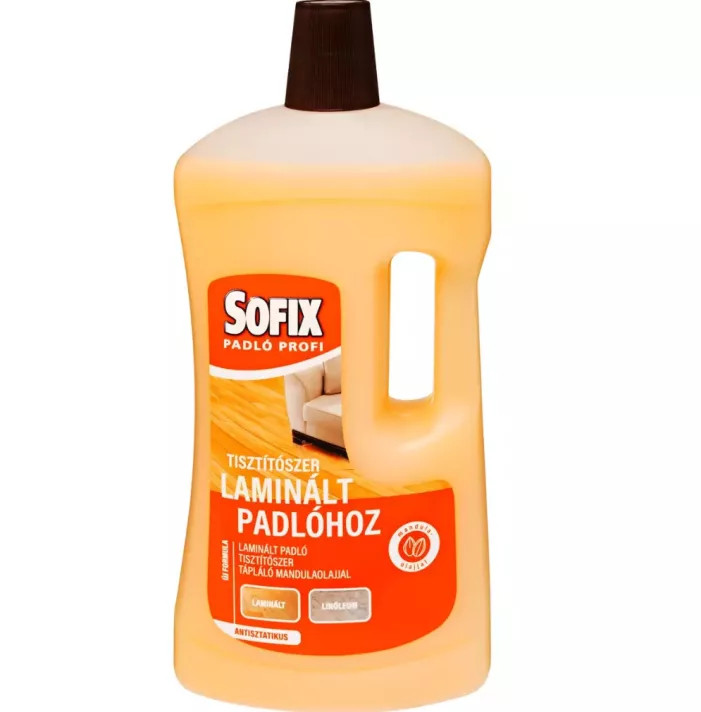 A hígított Sofix Laminált padlótisztítószer alkalmas laminált padlóra, linóleumra és parafára.